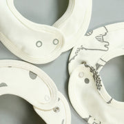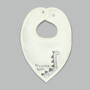 A 3-piece bib set made from soft, absorbent cotton featuring playful grey polka dots, “My Little Dino” print, and fun dinosaur sketches. Designed in a stylish bandana shape with secure snap closure, perfect for keeping your baby comfy and mess-free.