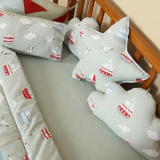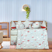 This delightful nautical-themed bedding set features a soft quilt adorned with charming sailboats and clouds in calming shades of blue, red, and white. The set is complemented by plush cushions in fun shapes, such as stars, adding a playful touch while ensuring extra comfort. Designed to create a warm and inviting atmosphere, this bedding set is ideal for a nursery or child's bedroom, promoting a peaceful and restful sleep.