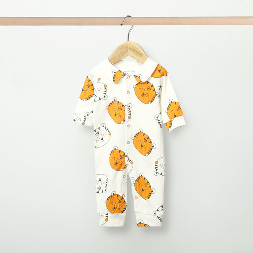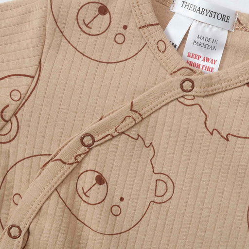 Dress your little one in comfort and charm with this cozy ribbed cotton romper in a soft off-white shade. Designed with brown-tone patch pockets, e...