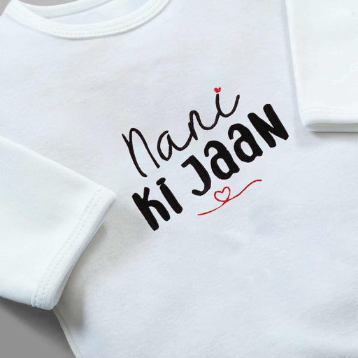 Introducing our Nani ki Jaan Embroidered Baby Romper! This adorable outfit features delicate embroidery with the sweet phrase "Nani ki Jaan". Made ...