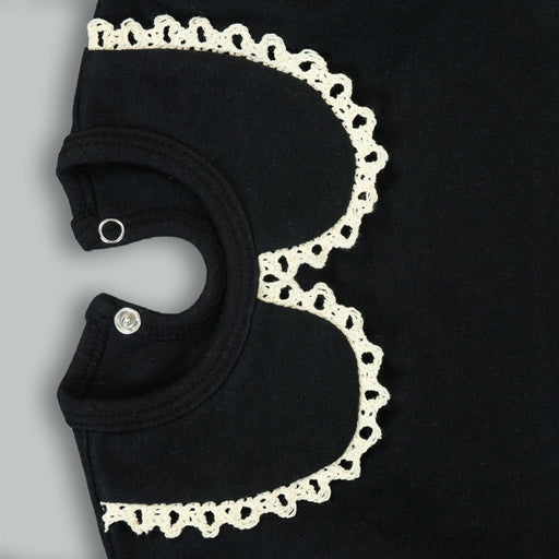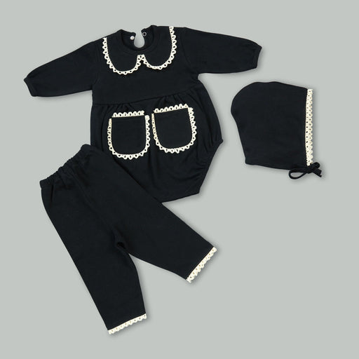 Adorn your little one in this elegant black three-piece bundle, featuring a lace-trimmed romper with a Peter Pan collar, matching pants, and a cozy...