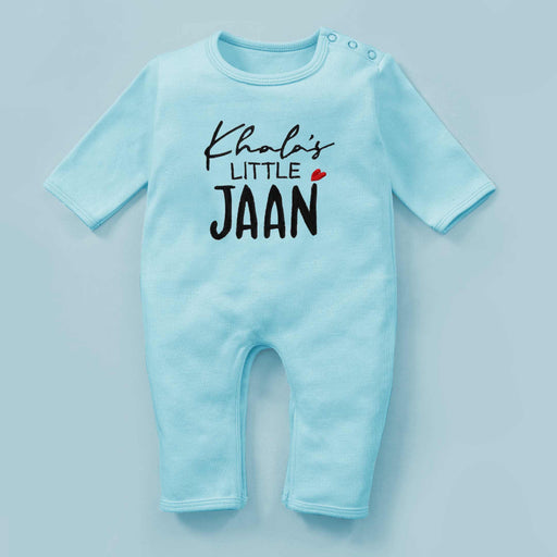 Introducing our Khala's Little Jaan Embroidered Baby Romper! This adorable outfit features delicate embroidery with the sweet phrase "Khala's Littl...