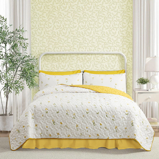 Designed for comfort and style, this beautifully quilted bedspread features delicate yellow floral prints on a soft white background, accented with...