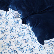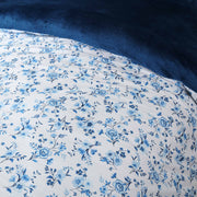The front showcases a delicate floral pattern in soft blue tones on a crisp white background, bringing a refreshing and graceful touch to your bedroom. The reverse side features a plush navy Fleece fabric, offering a luxurious feel and cozy warmth β perfect for peaceful nights and refined interiors. This razaye set ensures comfort, breath-ability, and long-lasting softness. The classic blue floral print adds a serene, hotel-style charm to any setting.