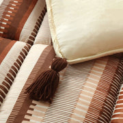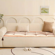 This is a quilted sofa topper with a rich and cozy striped geometric design. The pattern features a mix of warm earthy tones—including shades of brown, beige, cream, and terracotta—interwoven in varied stripe styles that include dashed, solid, and grid-like detailing. The topper is evenly padded in segmented rows, providing extra softness, warmth, and visual depth. It’s ideal for rustic, modern, or boho-style interiors and works perfectly to refresh or protect any seating area.