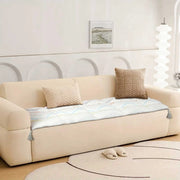 The sofa topper in your image features a modern, cozy design with a quilted surface. The fabric has a soft, matte texture and is patterned with sleek, wavy lines in muted yet colorful tones: gray, rust orange, light blue, and olive green. These curves create a calming, retro-modern aesthetic.