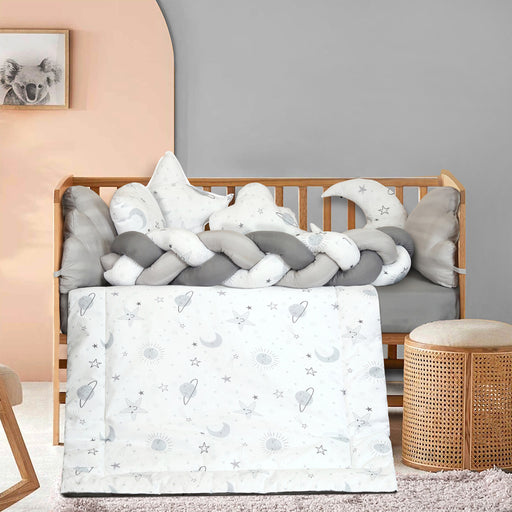 A stylish and cozy addition to your babyβs nursery. Designed with a space-themed grey scale print, this bedding set brings a modern, calming vibe w...