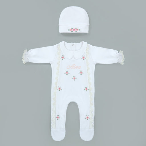 This charming bundle includes a white onesie decorated with dainty floral embroidery with customized name enhanced by lace detailing on the front. ...