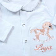 This elegant baby bundle features a soft white onesie adorned with an embroidered rocking horse motif with customized name in delicate pink thread. It includes a matching baby cap with the same design, a cozy pair of mittens, and a swaddle wrap beautifully embroidered with the same rocking horse and name. Perfect for newborn comfort and style.